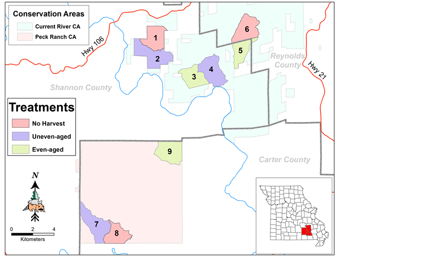 The MOFEP experiment employs a randomized complete block design (RCBD) of three blocks with the three management systems randomly assigned to three sites per block and a total of nine sites. MOFEP sites range in size from 314 to 516 ha. Each MOFEP site is an administrative compartment composed of 44 - 82 stands ranging from 0.2 - 62 ha. MOFEP sites are located on two MDC-administered Conservation Areas in southeastern Missouri (Figure 1). All MOFEP sites fall within the Current River Ecological Subsection of the Ozark Highlands
