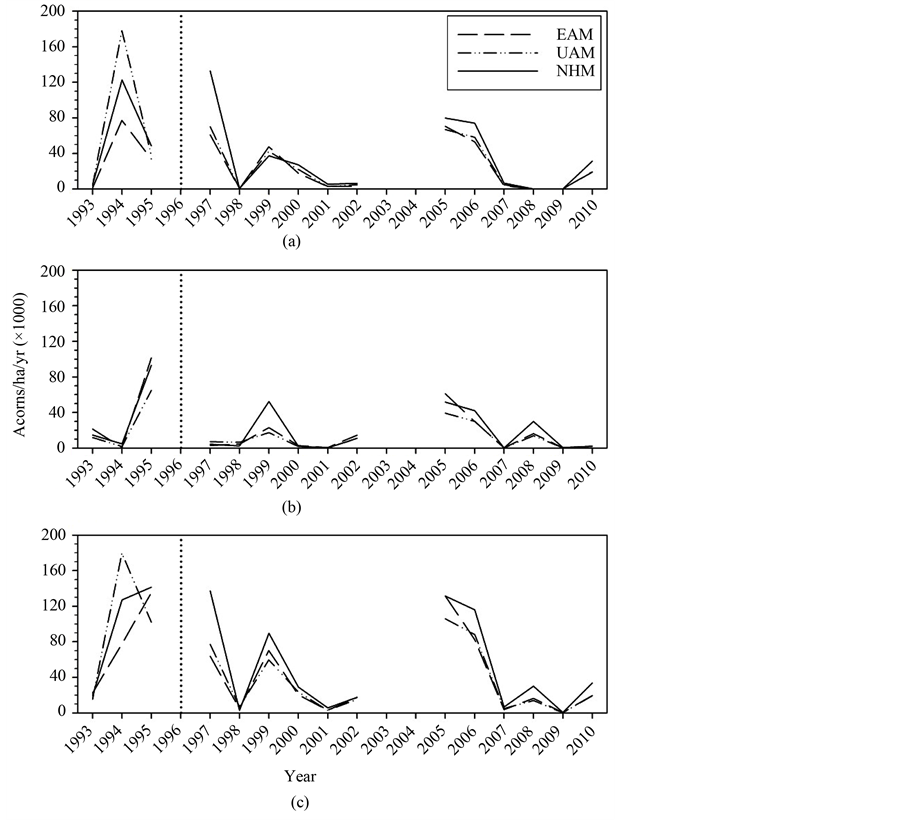 The production of mature, sound acorns exhibited substantial inter-annual variation yet temporal trends were fairly consistent across treatments. During the pre-treatment period (1993-1995), mean annual acorn yield of red oak species varied from 1100 acorns/ha in 1993 among sites designated for EAM to 178,000 acorns/ha in 1994 among sites designated for UAM (Figure 2(a)). Production by red oaks in 1994 among UAM sites was the highest recorded for this species group over the study period. Pre-treatment acorn production by white oak species varied from 700 acorns/ha in 1994 (UAM) to 101,000 acorns/ha in 1995 (EAM; Figure 2(b)). Over the first post-treatment period of MOFEP (1997-2010), acorn production by red oak species ranged from a high of 133,000 acorns/ha in 1997 under NHM to zero acorns collected in 2008 across the entire network of hard mast