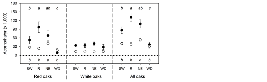 Figure 4. Mean annual production of mature, sound acorns (±1 standard error) by red oaks, white oaks, and all oaks on four ecological land types, averaged over forest management systems, captured before (1993-1995; black circles) and after (1997-2010; white circles) initiating forest management systems of the MOFEP experiment. Means followed by the same italicized letter within a species group are not statistically different based on Fisher’s protected least significant difference (α = 0.05). The top and bottom row of letters applies to pre-treatment and post-treatment means, respectively.