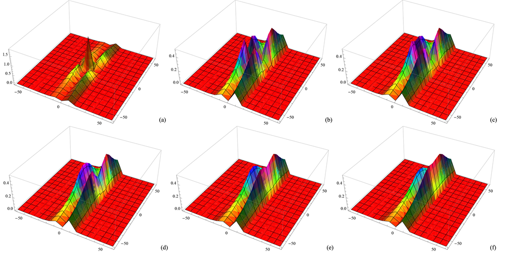 Figure 4. Profiles of with the parameters (26) at times (a), (b), (c), (d), (e), (f).