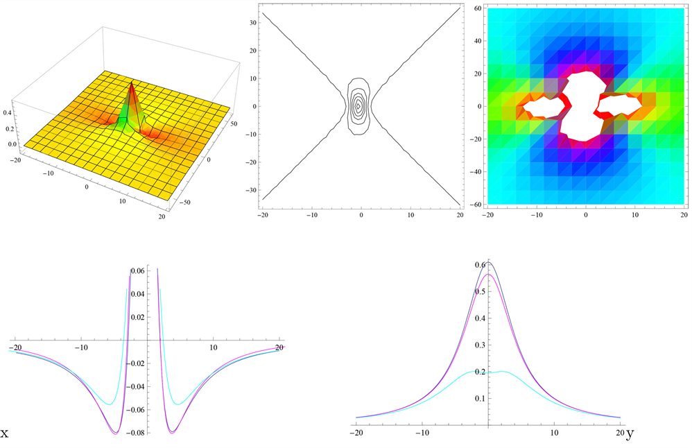 Figure 1. The profiles of with , density plot and x,y-curves with