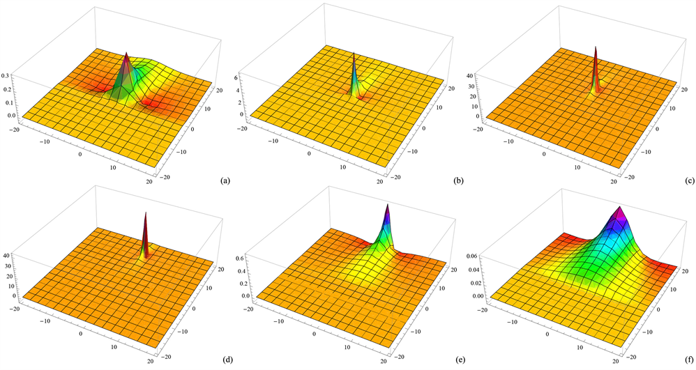 Figure 5. Contour plot of the with the parameters , , , , , when (a), (b), (c), (d), (e), (f).