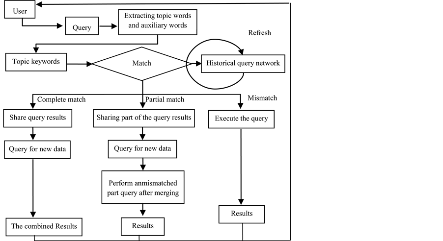 If the result is partially matched that it showed that the key words of the user’s new query request are extracted from the topic words and auxiliary words. The part of the theme words appeared before, so before the same query results through the query can be directly into the present query, that is, part of the history query results can be shared. Also due to historical queries only for a certain period of time before the data query, probably after the history query new data records may be generated, so the new data still need execute to obtain the new query results. The historical results and the new query results are merged to obtain the results of the query matching section. Then, in the result of the query matching part, it continues to perform the auxiliary word query and gets the final result of the user.