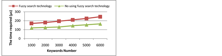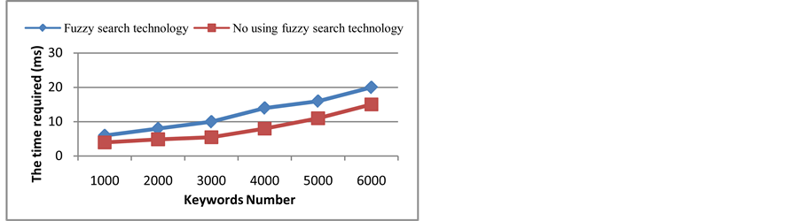 In this paper, the keywords fuzzy search scheme adds the cloud search method on the basis of literature [13] , but time complexity and space consumption are in the same level with the original program. The time complexity of the index construction of the pre-processing stage is related to the number of keywords n. That is O (n). The size of the index is also related to the number of words. That is O (n). In searching, due to the cloud server system support for multiple threads, you can also search the synonyms; fuzzy syllable word retrieval without increasing too much time consumption, so search time complex degree is O (n).