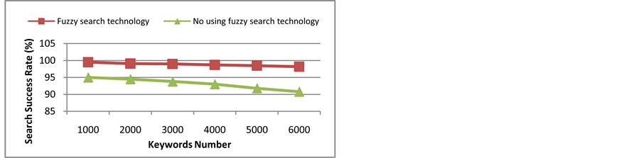 In this paper, we use the free cloud platform of the Amazon provided as the experimental platform and use the journal magazine as the search object to carry out the experiment. Through the comparison of this paper scheme and the method of no using the fuzzy search technology, the validity and practicability of the scheme are verified. When the index this paper scheme is built, with the increase of the number of keywords, the occupancy of CPU and memory gradually increase and the time consumed increases. The time consumed for building an index is shown in Figure 3. The time consumption of the keywords query is shown in Figure 4. The success rate of the query is shown in Figure 5.