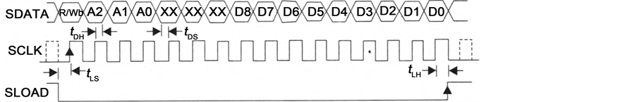Figure 3 is the AD9822 register serial write timing diagram. When the strobe signal SLOAD is at the low level, data on the data line SDATA is serially written to the A/D internal register at the rising edge of the clock SCLK. In Figure 3, the 16-bit data of SDATA are composed of the selected bits of the read and write operations, the selection bits of the register address and the 9-bit register data.