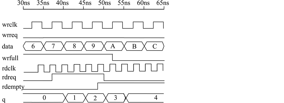 Figure 5 and Figure 6, respectively, for the FIFO write timing diagram and read timing diagram. When the write request wrreq signal is valid, write data to the FIFO, when the full flag wfull is high cannot write data, while triggering DSP interrupt, DSP ready to read the data; When the read request rdreq signal is valid, by EDMA Channel, the DSP begins to read the FIFO data, when read empty flag bit rdempty is high cannot continue to read, while FPGA control bit initialization FIFO, ready to write the next line of data.