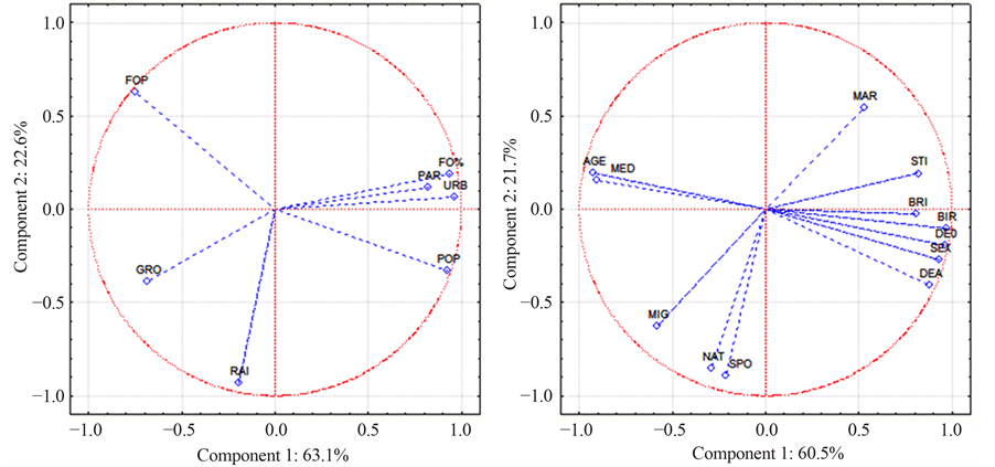 The PCA applied to demographic indicators extracts the 82% of the total variance on the first two axes.