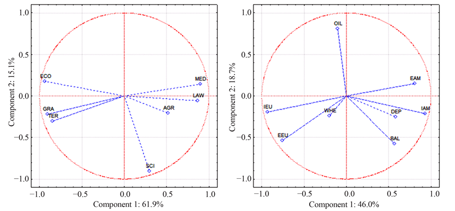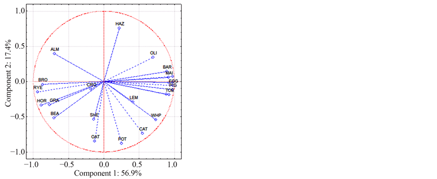 The PCA applied on trade variables reveals a specific modernization pattern illustrated by the first two axes explaining the 67% of the total variance and mainly based on the increase of both import from and export to North America, primarily United States of America, and the consequent decline of import and export trade from and to Europe. Component 2 well highlights another element of modernization, i.e. the increased dependence on oil against carbon for satisfying the energy demand at the country scale. Finally, the PCA applied to agricultural variables reveals a more complex pattern extracting the 74% of the total variance and illustrating the opposition between crop with increasing production (BAR, MAI, TOB, together with EGG and PIG) and more traditional crop with decreasing production (BRO, RYE, ALM, HOR) along the first component. The second component better highlights time patterns especially linked with the production of crop concentrated in specific areas of the country such as ALM and OAT.