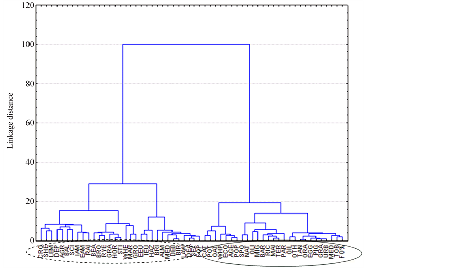 Based on hierarchical clustering, the dendrogram reported in Figure 2 classified the 58 indicators in two homogeneous groups using a 70% similarity threshold based on their time pattern along the period investigated. The left cluster includes 31 variables with a non-linear trend, alternating periods of growth to time intervals with a (less or more) rapid decline and being strongly influenced by the two major wars (1914-1918 and 1940-1945). By contrast, the right cluster includes 27 variables with a linear and continuous time pattern. These variables can be considered as reliable candidates for indicators of modernization, demographic transition and environmental (forest) transition. Modernization indicators include demographic, environmental, education and trade variables together with a major proportion of agricultural variables.