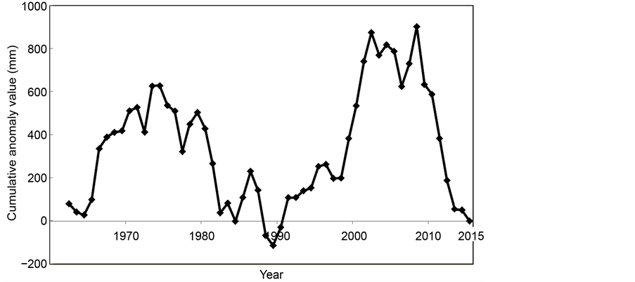Figure 7 shows the cumulative rainfall anomaly curve. According to the above method, the rainfall from 1962 to 2015 is substituted into Equation (1), the cumulative anomalous value of each year is calculated, and the cumulative rain- fall anomaly from 1962 to 2015 is plotted. As can be seen from Figure 7, the