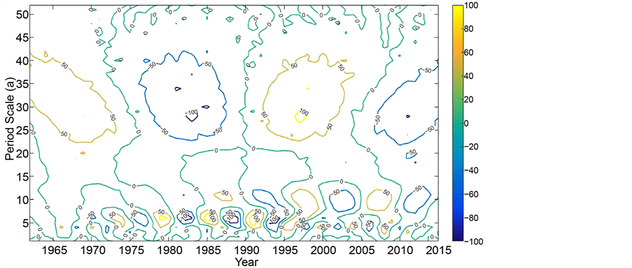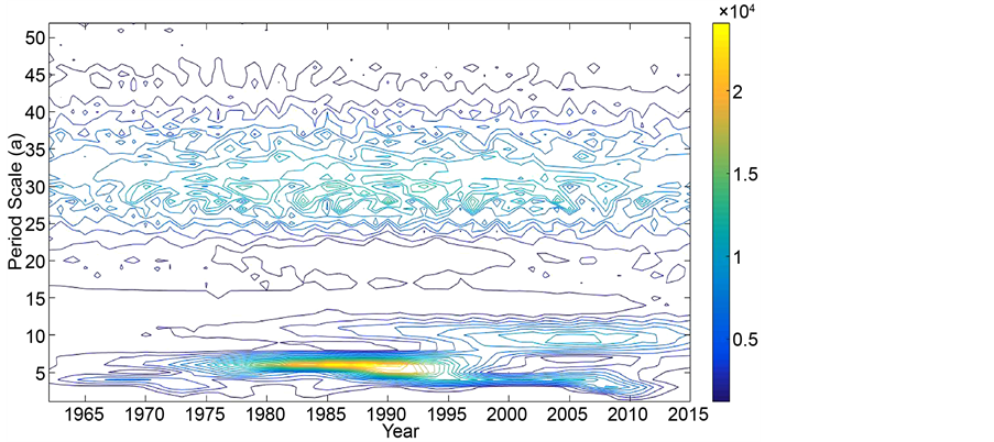 Figure 8 shows the time-frequency distribution of the Morlet wavelet transform modulo square. It is found that the signal intensity is different at different period scales. The signal intensity of 6 ~ 10 years is strong, that mainly occurred in 1976~1996, 2000~2010; The signal intensity of 32 ~ 44 years is weak, that distributed in the entire period scale.
