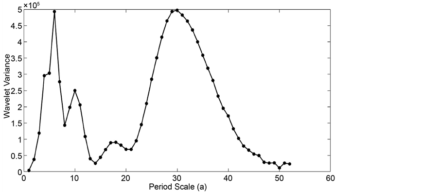Wavelet variance gets changed with the period scale. Figure 10 can reflect the annual rainfall in the period series that contains a variety of cycle fluctuations and its energy intensity with the period scale of the characteristics of change. Each peak corresponds to a significant period. It is possible to determine the main period exists in period series. The peak of the wavelet variance appears in the period scales of 6, 10, 18 and 30. The periodic oscillations of 6 and 30 years are intense that makes more sense on the study of wavelet transform process.