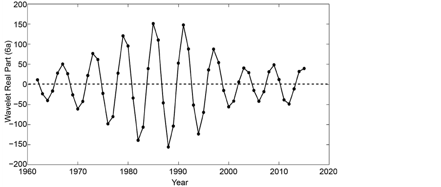 Figure 11 shows the real part of the 6a-period scale wavelet transform changes periodically with the year number. The amplitude from 1979 to 1999 is larger than that from 1962 to 1978 and from 2000 to 2015. The real part of the wavelet transform with the end of year number is 9 and 5, that is the positive peak. The real part of the wavelet transform with the end of year number is 2,