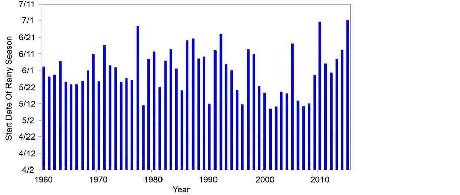 Figure 1 shows the start date of rainy season occurred on May 8th, 2001 is the earliest; The start date of rainy season occurred on July 1st, 2015 is the latest; The average value of the start date of rainy season from 1962 to 2015 is May 31st.