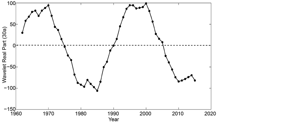 Figure 12 shows the real part of the 30a-period scale wavelet transform changes periodically with the year number. 1962~1990 is the first cycle, 1990~2015 is the second cycle. It is found that the wavelet real part of 1962~1974 and 1990~1998 increased with the year number, the wavelet real part of 1974~1985 and 1998~2010 decreased with the year number, the wavelet real part of 1985~1990 and 2010~2015 increased with the year number.