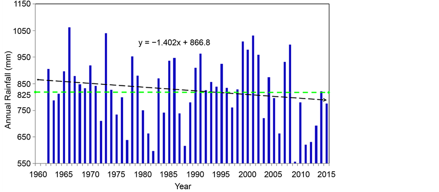 mm. The annual rainfall was the largest in 1966 and the smallest in 2009. The correlation coefficient between annual rainfall and year number from 1962 to 2015 was 0.18, that has passed the significance test of the confidence level of 0.05. The annual rainfall trend decreases with the year number is significant.