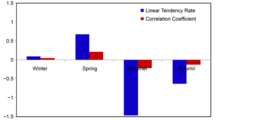 Figure 4 shows the linear tendency rates and correlation coefficient of seasonal rainfall. The linear trend of summer and autumn rainfall is negative, indicating that the rainfall in summer and autumn decreases with the year number, and the trend of decreasing rainfall is summer > autumn. The correlation coefficient of rainfall in summer and autumn did not pass F-test with significance level of 0.05, indicating that the rainfall in summer and autumn decreased with the year number is not significant.