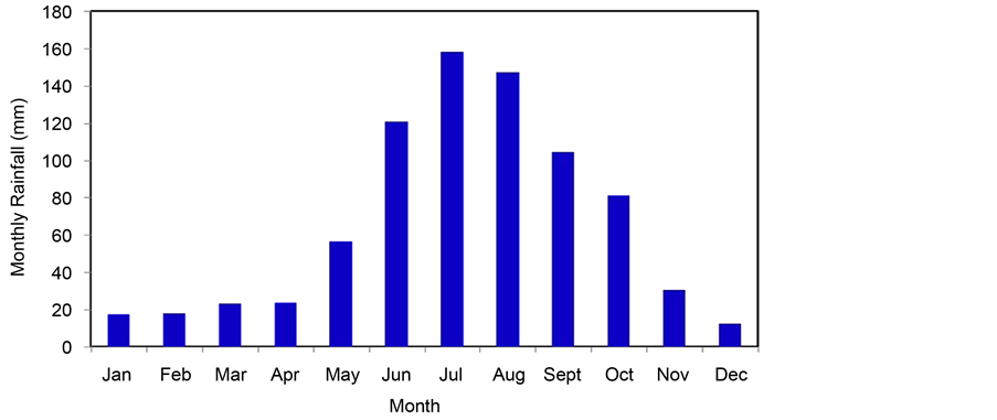 Figure 5. Monthly rainfall in Dali prefecture from 1962 to 2015 (mm).