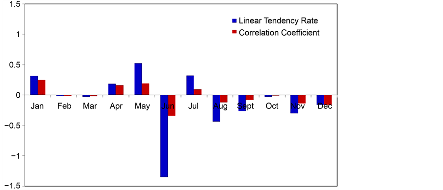 Figure 6 shows the linear tendency rates and correlation coefficient of monthly rainfall. The linear trend of the monthly rainfall was negative in February, June,