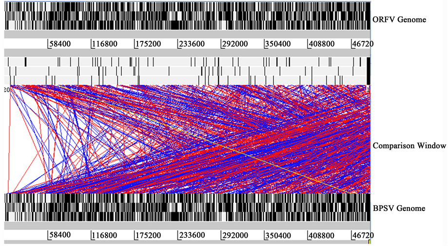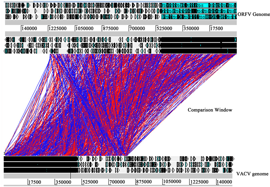 Figure 3. Comparative genomics of ORFV with other two closely related viruses BPSV and VACV. The red and blue bars indicate regions of similarity with red bars indicating corresponding regions that are oriented similarly and blue bars indicating regions oriented in opposite directions. Comparison of whole genome by ACT. The top view shows the subject sequence ORFV and the bottom view shows the query sequence: (a) Comparison of BPSV with ORFV; (b) Comparison of VACV with ORFV.