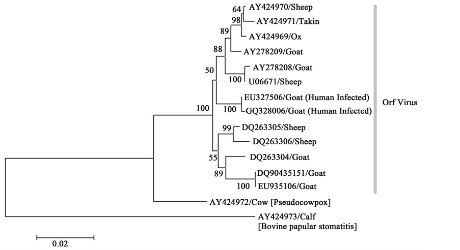 - Kumar, N., Wadhwa, A., Chaubey, K.K., Singh, S.V., Gupta, S., Sharma, S., et al. (2014) Isolation and Phylogenetic Analysis of an Orf Virus from Sheep in Makhdoom, India. Virus Genes, 48, 312-319. http://dx.doi.org/10.1007/s11262-013-1025-9