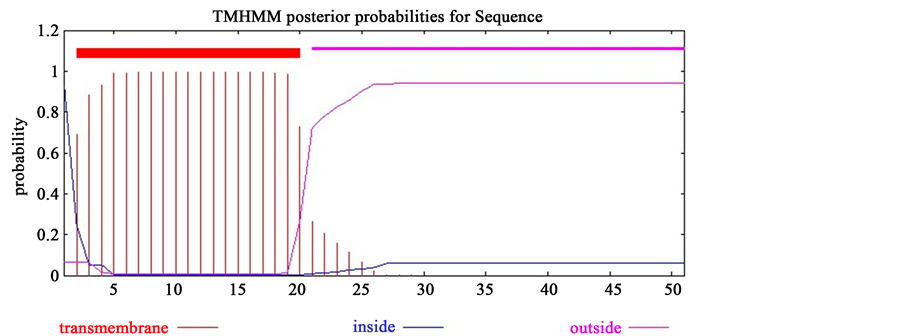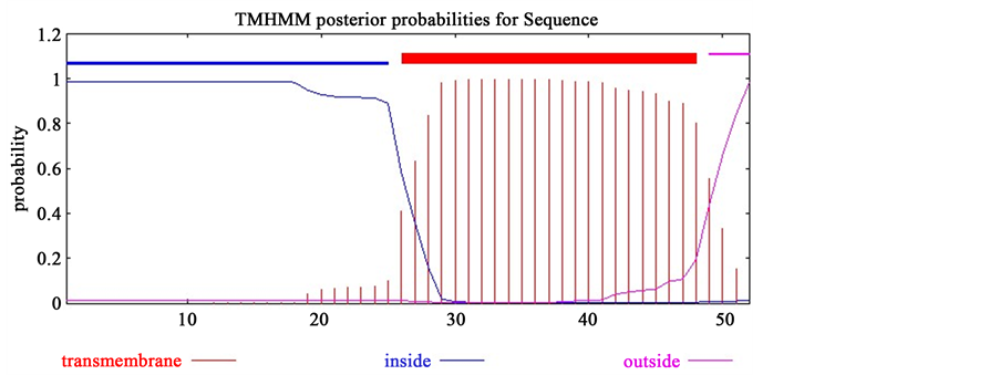 All four unique genes were further evaluated to determine the TM helics. ORF 039 contains TM helices in between 2 - 20 amino acid (aa) in their C-terminal region in which inside helices is in 21 - 51 aa. On the other hand, ORF 116 contains TM helices in between 26 - 48 aa, in which 1 - 28 aa are inside the membrane and 49 - 52 aa are outside the membrane (Figure 1).