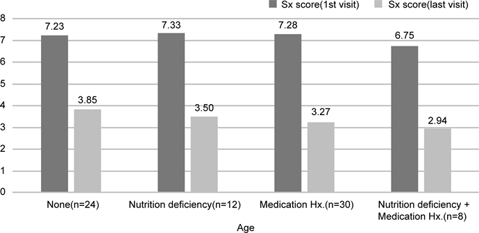 Figure 3. First and last visit symptom scores according to association of possible causative factors. Hx: history; Sx: symptom.