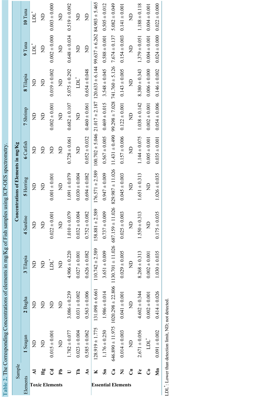 Table 2 shows the corresponding concentrations of toxic and essential elements in mg/Kg of analyzed fish samples namely (Seagan, Bagha, Tilapia, Sardine, Herring, Catfish, Shrimp, Tuna) using inductively coupled plasma optical emission (ICP-OES) spectrometry.