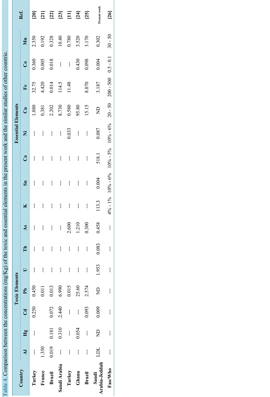 Table 4.Comparison between the concentrations(mg/Kg) of the toxic and essential elements in the present work and the similar studies of other countrie.