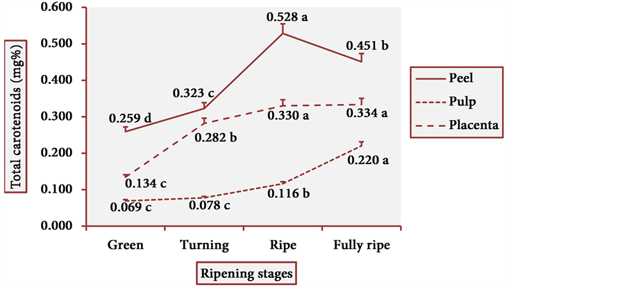 The results of total carotenoid content are illustrated in Figure 9. From the green to the turning peel, the total carotenoid content increased progressively and significantly, then peaked in the ripe peel and slightly decreased in the fully ripe peel. There was an exponential growth in the total carotenoid content from the green to the fully ripe pulp. In placenta, there remained an increasing trend in the levels of these pigments, with higher values than those of the pulp. Hence, in the cultivars studied herein, the red- purple colors that appear in the fully ripe peels of cubiu fruits are due to carotenoids and not to anthocyanins.
