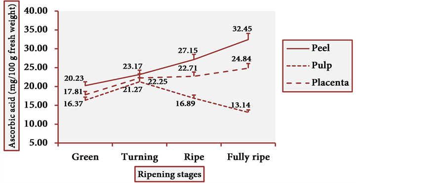 [75] [76] [77] [78] [79] . Ascorbic acid is uniformly distributed in fruit tissues whereas phenolic compounds (e.g. flavonoids) are preferably located in the peel and to a lesser extent in the pulp [80] . This observation is in accordance with the present results. The DRI (RDA) for adults is 60 mg of ascorbic acid per day [24] [81] . Cubiu is a rich fruit in ascorbic acid―particularly the peel and the placenta at the fully ripe stage―and should be included in the human diet as a palatable source of this essential micronutrient. Besides, its remarkable content in iron makes it recommendable for iron-deficiency anemia [17] . Unfortunately, there are no other studies comparing the ascorbic acid content in cubiu tissues at different ripening stages. There is also a lack of studies comparing the ascorbic acid content in different tissue portions of other Solanaceae fruits at diverse ripening stages. The pertinent studies available, for the most part, make the comparison difficult because they take into account only the content of ascorbic acid in the pulp of ripe fruits and use a different analytical method (e.g. titrimetric instead of spectrophotometric). To finish, regardless of the high content of ascorbic acid, TA and pectin in cubiu fruits, the expression “citric fruit” is reserved for the fruit species of the genus Citrus L. of the Rutaceae family.