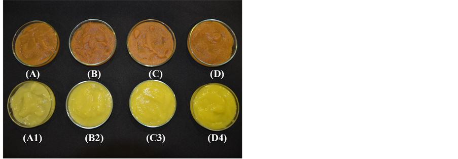 Figure 3. Beneficial effect of hot water blanching on the preservation of cubiu pulp colors. Note: Homogenized cubiu pulps at the (A) green, (B) turning, (C) ripe and (D) fully ripe stages without previous blanching and subsequent fast browning in less than 2 minutes (control process). Previously blanched and subsequently homogenized cubiu pulps at the (A1) green, (B2) turning, (C3) ripe and (D4) fully ripe stages with preservation of the natural colors of the pulp for 24 hours at ambient temperature (intervention process).