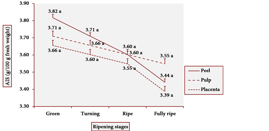 Figure 4. AIS behavior in three tissue portions of cubiu fruits at four ripening stages. Note: Means followed by the same letter did not significantly differ between variables at the level of 5% probability by the Tukey test.