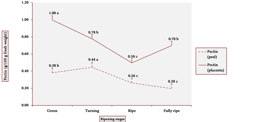 Figure 5 shows the pectin content in the peel and the placenta of cubiu fruits. The results clearly demonstrated a similar pattern of behavior in the tissue distribution of