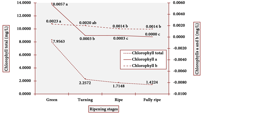Figure 7. Chlorophyll levels in cubiu fruit peels during ripening. Note: Means followed by the same letter did not significantly differ between variables at the level of 5% probability by the Tukey test.
