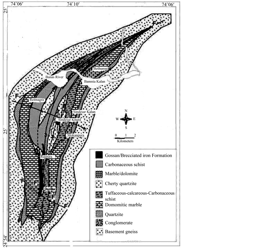 The Archaean basement comprising of gneiss, schist, amphibolite, quartzite and granite dating back to 3.2 to 2.5 by showing unconformable relationship with the Aravalli cover rocks, is clearly marked in and around Udaipur. Stratigraphic succession, established by [3] for the Aravalli Supergroup of the type area around Udaipur and Zawar shows two major groups separated by an unconformity. The Upper Aravalli Group consists of greywacke-slate-phyllite, quartzite, dolomite and siltyarenite (host for sulphides of zinc and lead) while carbonaceous and pelitic phyllites, dolomite, quartzite, stromatolyte, phosphorite, chlorite schist, amphibolite, quartz arenite and local conglomerate [4] belong to Lower Aravalli Group. In general, Aravalli rocks in Udaipur region show a low-grade metamorphism. The recrystallisation of the silicate minerals suggests the grade of metamorphism to be of greenschist facies [5] .