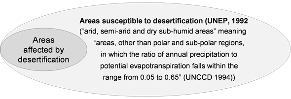 Desertification should be sought in areas susceptible to desertification, noting that areas susceptible to desertification are not areas actually affected by desertification, and that “affected areas”, in the context of UNCCD [8] , are the “arid, semi-arid and/or dry sub-humid areas affected or threatened by desertification” (Article 1, point h). Figure 1 illustrates the difference between area susceptible to desertification and area affected by desertification.