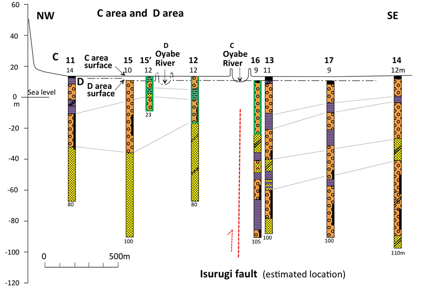 In previous studies, [20] - [23] , and many others have described the Isurugi fault as active. [24] and [25] observed outcropping of a back thrust with upheaval of the plain side on the lower terrace in the Kamimukuta area of Fukuokamachi (Ka of Figure 2), in the city of Takaoka; they estimated that the Isurugi fault was active from roughly 4000 to 900 years ago, with an average activity interval of about 2000 years. [26] and [27] conducted a shallow seismic reflection survey in a SE-NW direction across the Tonami Plain and found that, in the northern part of the city of Oyabe, the Isurugi fault was a reverse fault with an uplifted western side. They estimated the location of the master fault to be near the Oyabe River.