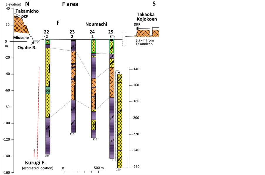 The Horinji fault lies at the southeastern foot of the Iozen Mountains, on the southwestern part of the Tonami Plain (Figure 1 and Figure 2). The higher, middle, and lower terrace gravels, and others that are steeply tilted or cut by the fault, can be observed along it. According to [28] - [30] , pit surveys in the Yassui area(Ya of Figure 2) of the city of Nanto have confirmed the existence of a reverse fault, the northwestern mountain side of which is uplifted, cutting the lower terrace sediments. Topographic displacement caused by the fault has also been confirmed in the nearby area.
