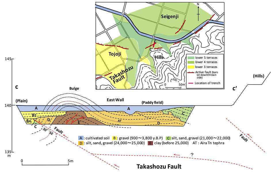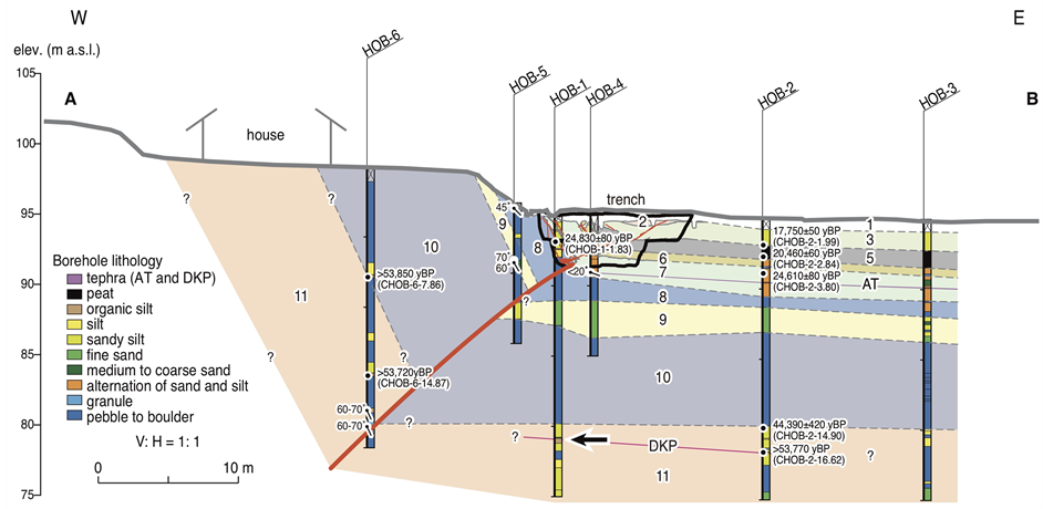 [24] conducted a trench survey of the Horinji fault in the Horinji area (Ho of Figure 2). The survey confirmed the existence of lower terrace sediments containing AT tephra in their lower layer, between sand and silt, and the existence of a reverse fault, the mountain side of which was uplifted. The fault cut the Holocene sediments. The sediments were dated, and from the results it was estimated that the most recent period of activity of the fault was roughly 5600 years ago (Figure 7). In addition, it was estimated that the fault may extend northward in a concealed form.