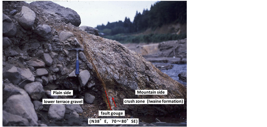 The fault that runs obliquely to the Takashozu fault is the Johana-Kaminashi fault. It trends NNW-SSE and cuts across the western part of the Takashozu Mountains (Figure 1). [34] pointed out that the geological features differ markedly between the two sides of the fault. Although there is as yet no confirmed direct proof that the Johana-Kaminashi fault is active, an outcrop of a reverse fault in which the Futomiyama formation is pushed over a lower terrace gravel from the east can be observed in the Futatsuyagawa fault, located immediately west of the Johana-Kaminashi fault [21] .