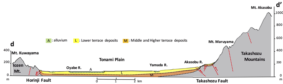 Figure 10. Topographic profile of d-d' and active faults. (Based on 1:25,000 topographic maps and 5 m-DEM data of GSI).