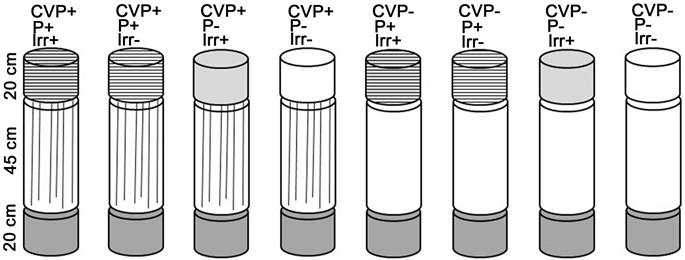 A multifactorial microcosm experiment was established with two different phosphorus concentrations in the topsoil (P+/P−), irrigation (Irr+/Irr−) and presence of continuous vertical pores in the subsoil (CVP+/CVP−) as factors. The experiment was conducted in PVC-pipes with an inner diameter of 19 cm and a total height of 85 cm (Figure 1). Upper segments (height: 20 cm), were filled with topsoil from plots of field experiments with P deficiency (research farm “Dikopshof”, University of Bonn) or elevated P concentrations (experimental station “Campus Klein Altendorf”, University of Bonn). For all treatments, middle and lower segments (height: 45 and 20 cm) were filled with subsoil from the latter site. Both soils have developed from Weichselian loess. Detailed information about soil properties is listed in Table 1. Mean annual temperature and annual precipitation are 9.7˚C and 630 mm at “Dikopshof” and 9.6˚C and 625 mm at “Campus Klein Altendorf”. Topsoil and subsoil were sieved to 5 and 2 mm prior to experimentation. Soil in upper and lower