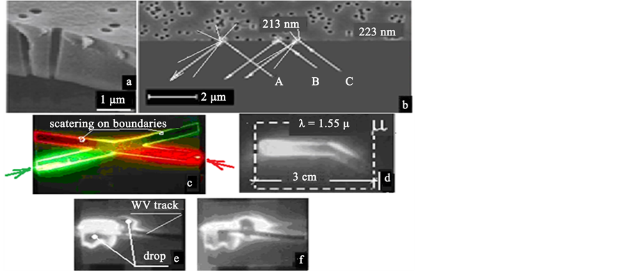 Figure 1. Cross-section of the PET film with pores (a); explanation of light beam reflectance from the interface of a pore less film and a film having randomly arranged pores (b); (c) (d) light wave propagation in some waveguide elements; (e) (f) wave tracks passing the drops.