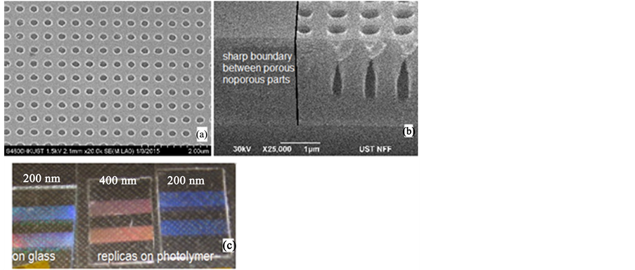 For the first experiments, the polyimide films of 4 micrometer in thickness with the RI = 1.8 were used. Films were formed by spin coating the glass substrates of sizes 2 × 2 cm. The non-through pores of 2 μm in depth with the pores’ diameter equal to 200 or 400 nm were obtained by interference lithography and ion-plasma etching methods. The distance between the pores was equal to 400 or 800 nm, respectively (Figure 2). In addition, to enhance the future technological production of waveguides, the successful attempt to transfer by replication the pores film topography from the glass substrate to the polymer substrate was made. Figure 2(c) shows that replica has the same spectral composition as the original sample.