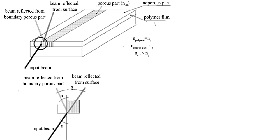 At illumination of the edge of a substrate by a non-collimated laser beam of a diameter 3 - 4 mm, the input beam was partly reflected from the outer surface of the substrate and partly transmitted to the waveguide. The transmitted beam crossed the boundary between the porous and non-porous parts (Figure 3) at some small angle.