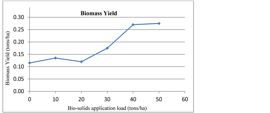 The increased in bio-solids treatment indicated by increased plant biomass. Results obtained were showed that the highest dry biomass value was obtained with bio-solids loading rate 40 tons/ha and more. Increasing rate of application after 40 tons/ha did not show significant differences in the biomass yield (Figure 5).