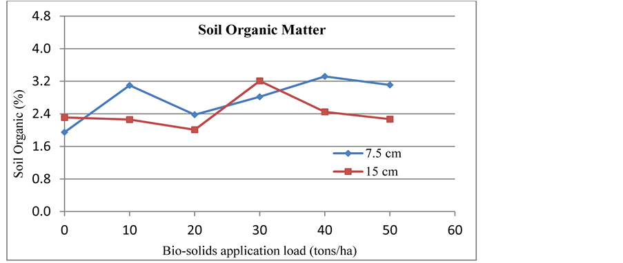 Results of soil organic matter contents after bio-solids application showed that an increase in organic matter content when soil treated with different application rates of bio-solids (Figure 7). The effect of bio-solids application on the soil organic content may be more reasonable after the adequate time for microbial decomposition of the applied bio-solids.