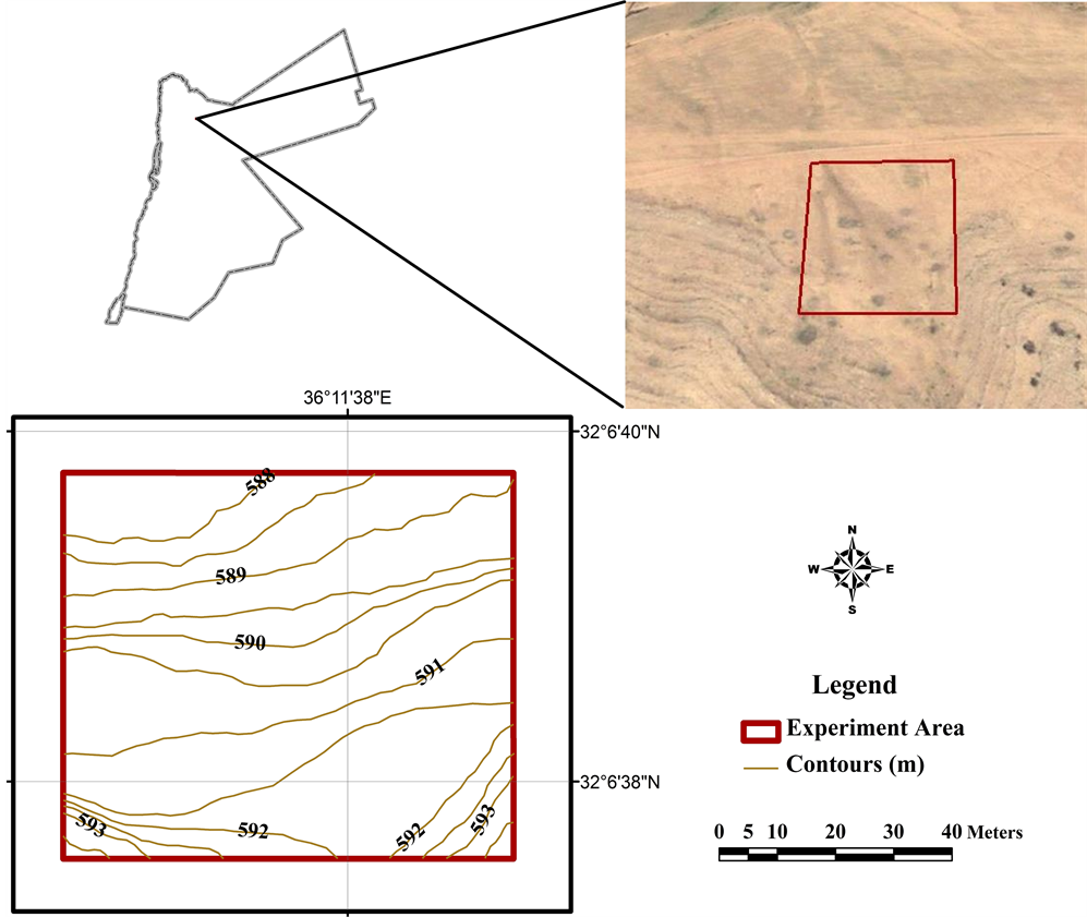 The experiment was conducted in the Hashemite University (HU) area, north of the Amman city, (32˚06'39"N and 36˚11'38"E) with elevation of the study area approximately 590 m. The topographic survey and Google Earth image of the site is shown in Figure 1.